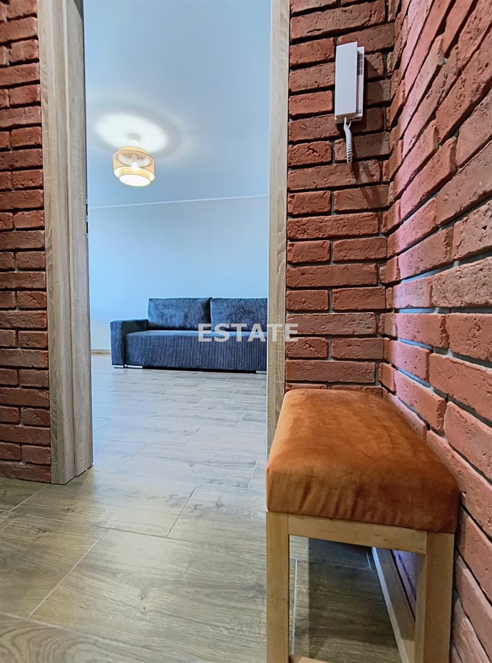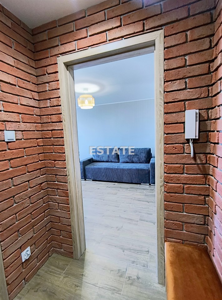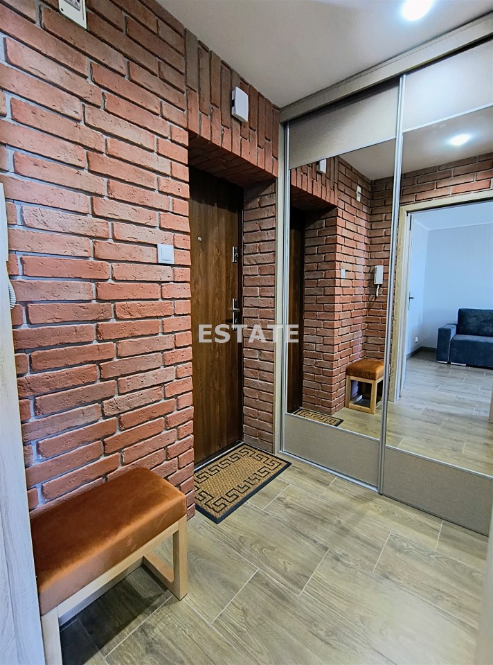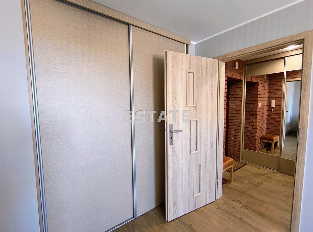 na wejściu urokliwe, ceglane ściany nadające mieszaniu charakteru i przytulności, pojemna szafa na korytarzu – dużo miejsca do przechowywania