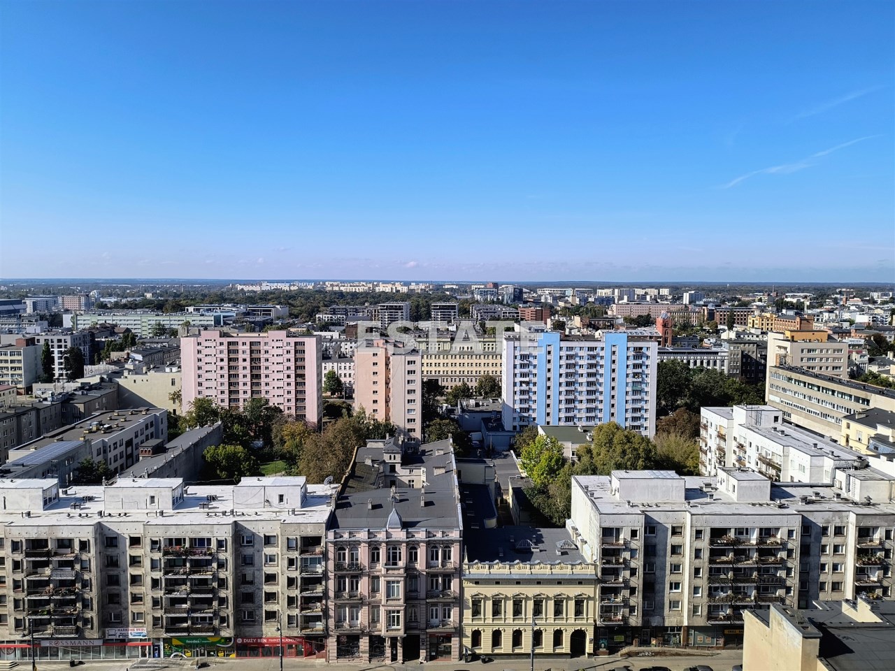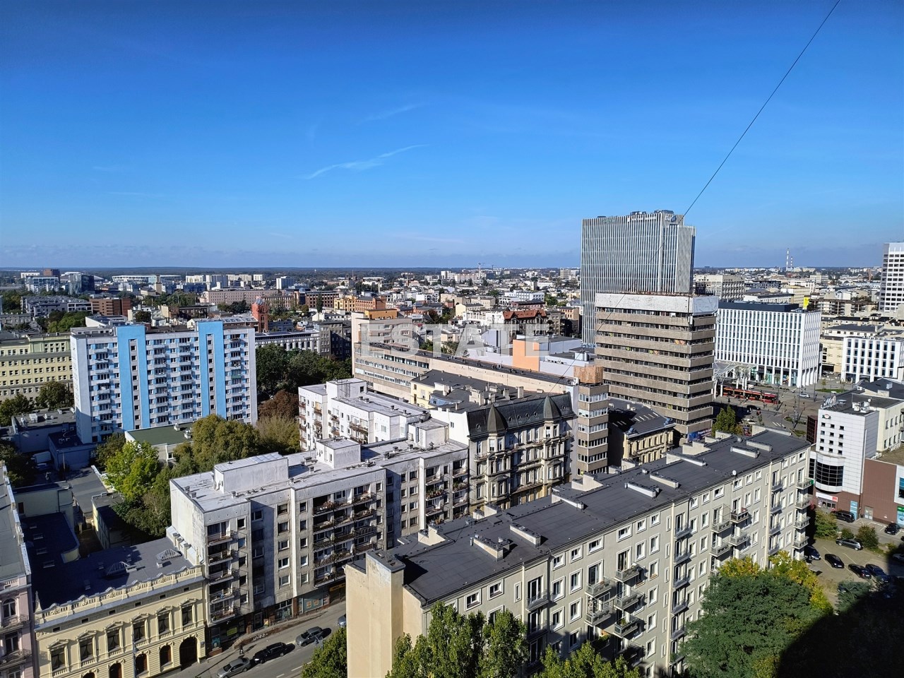 18 piętro z zapierającym dech w piersiach widokiem na panoramę Łodzi, gdzie rozciąga się przestrzeń miejskich historycznych kamienic, zielonych parków i tętniących życiem ulic — widok, który robi ogromne wrażenie o każdej porze dnia i nocy