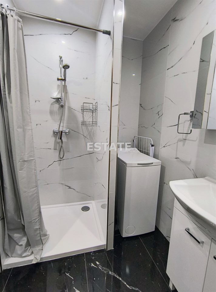 jasna łazienka z natryskiem, łączona z WC, wyposażona w umywalkę, lustro oraz praktyczną pralkę